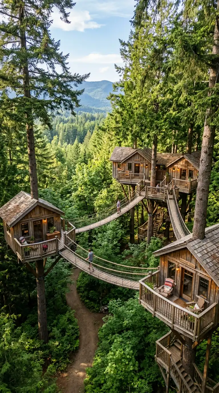 The treehouse hotel is a hotel with guest rooms in treehouses. Each treehouse is a small wooden cabin in the trees. The treehouses are connected by bridges or stairs. The treehouse hotel is elevated, forested, and magical.