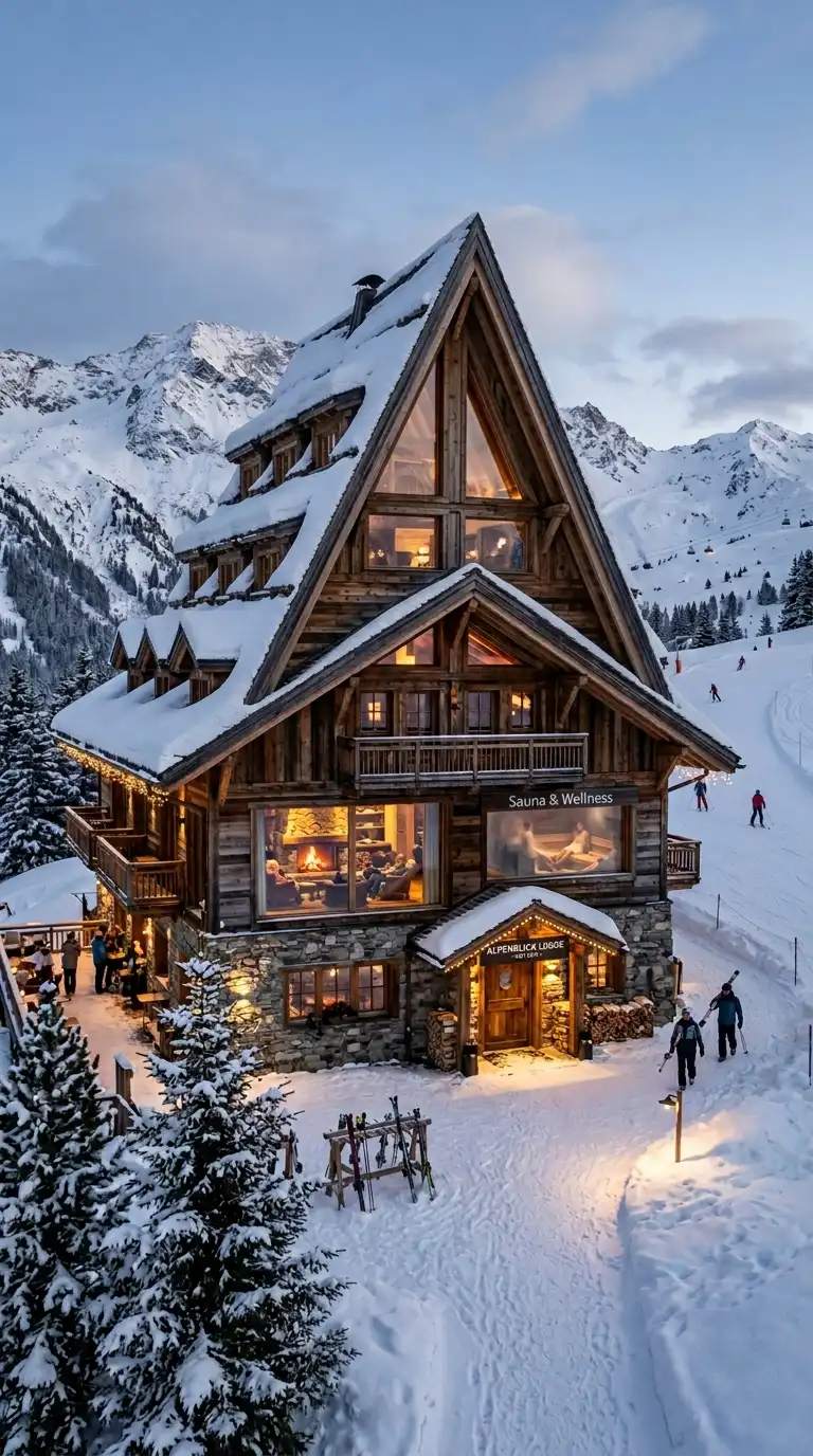 This design is ideal for ski resorts and winter travellers. The emotional effect is alpine, cosy, and mountain-adapted.