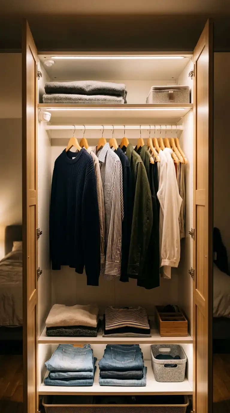 Internal lighting instantly elevates a PAX wardrobe from utilitarian to luxurious. Motion-sensor LED lights turn on automatically when you open the doors, adding convenience and ambiance. Warm-white adhesive LED strips (2700K–3000K) are ideal for a cozy glow. Place lights along the top edge, on shelves, or inside drawers.