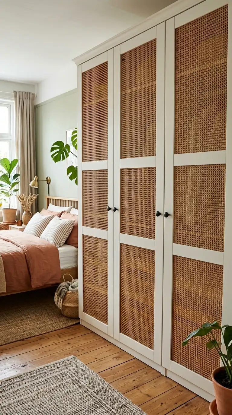 For a touch of natural texture and boho charm, cut out sections of your PAX doors and fill them with cane or rattan webbing. Use a jigsaw to create the openings, then attach the webbing with a staple gun. This hack works beautifully on wardrobe doors, adding warmth and a handcrafted feel that softens the overall look.