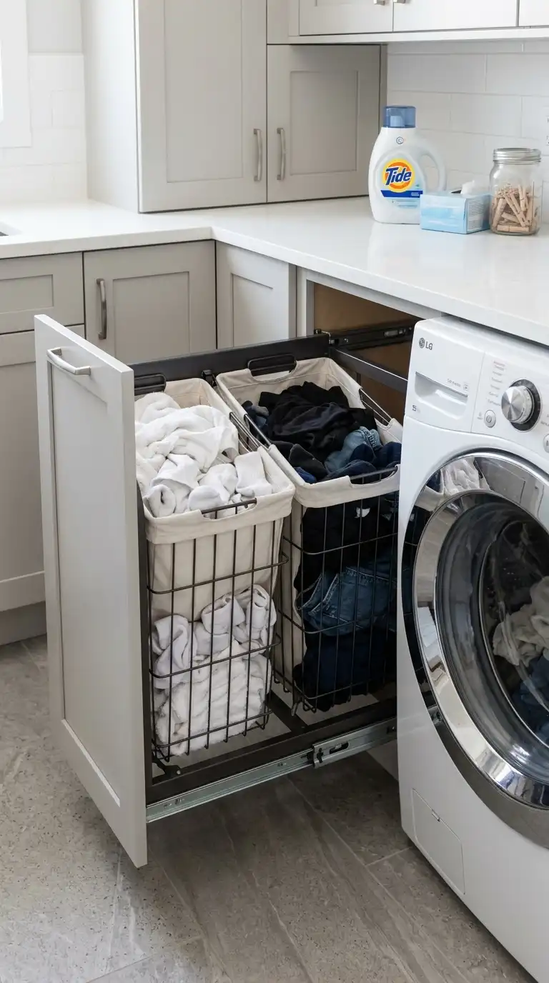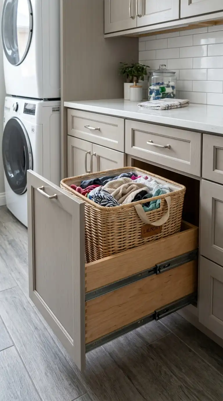 For a truly custom look, install a large pull-out drawer at the base of your cabinetry designed to hold a laundry basket. The drawer glides out, revealing the basket. When closed, it looks like a regular drawer. This is ideal for high-end laundry rooms with custom cabinetry.