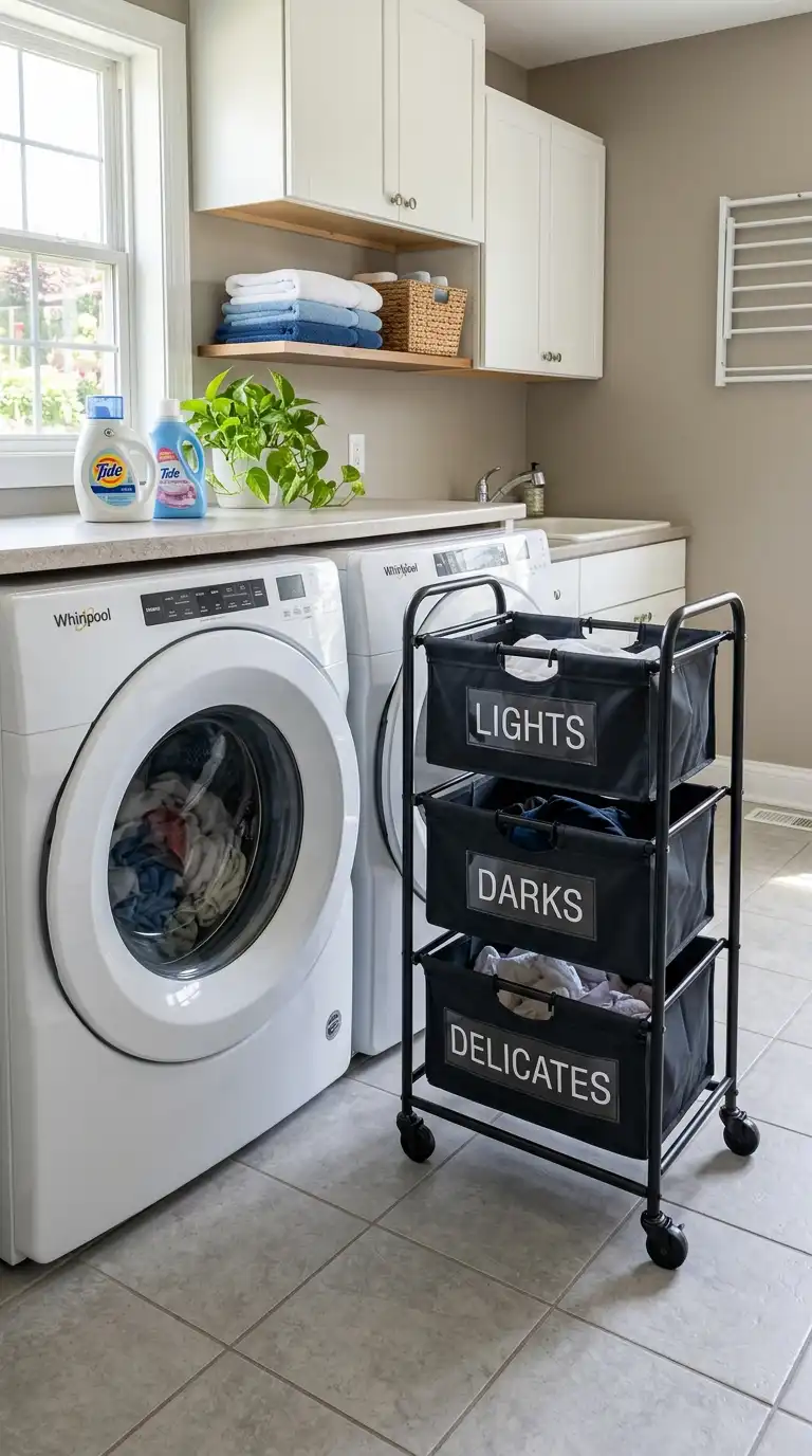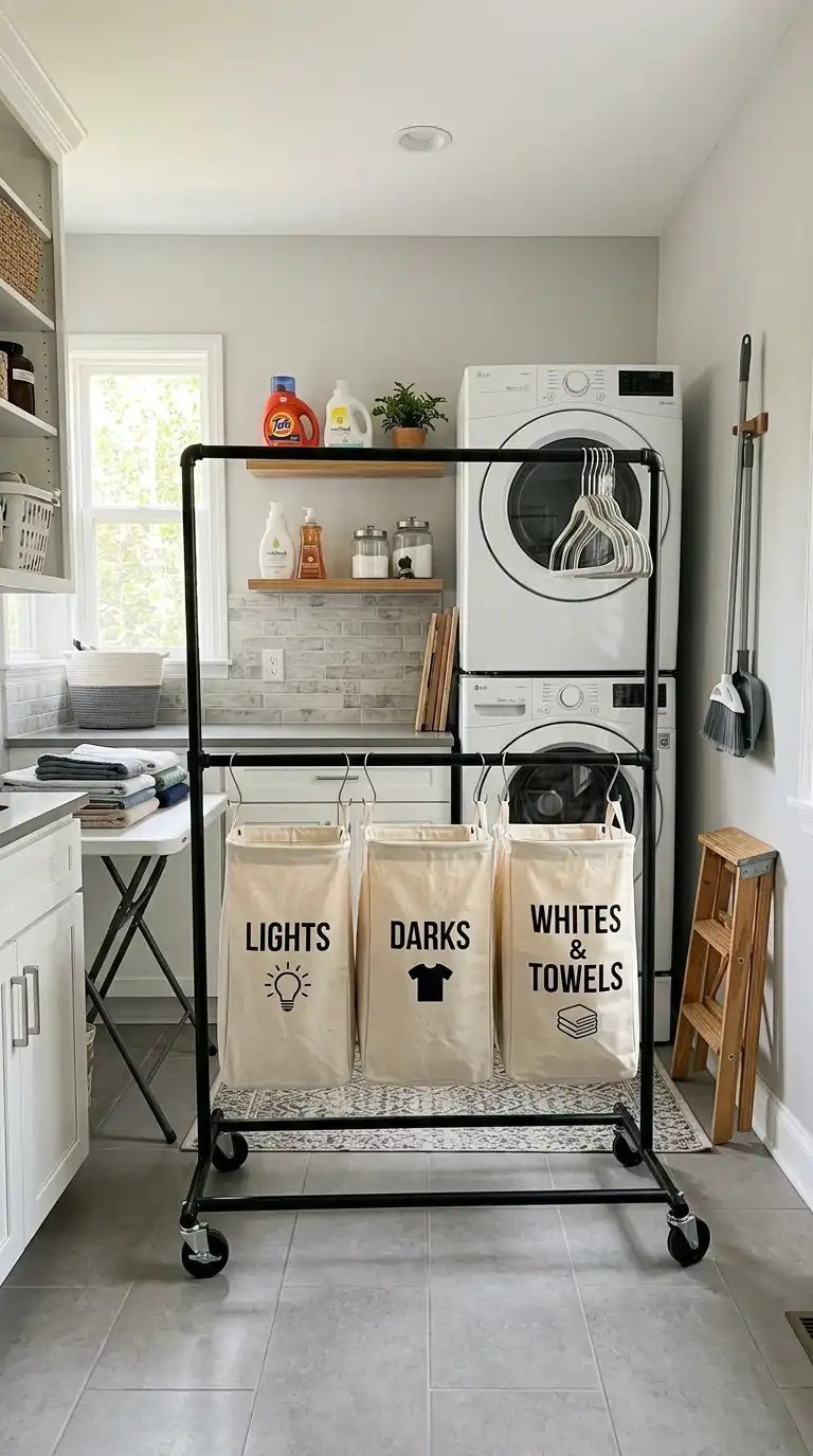 A rolling cart with removable laundry bags is both flexible and functional. Use a three-tier cart with labeled bags for sorting. Roll the cart to the washer when it’s laundry day, then roll it back to its storage spot. Choose a cart with locking wheels for stability. This is perfect for small spaces or for families who sort laundry in a different room.