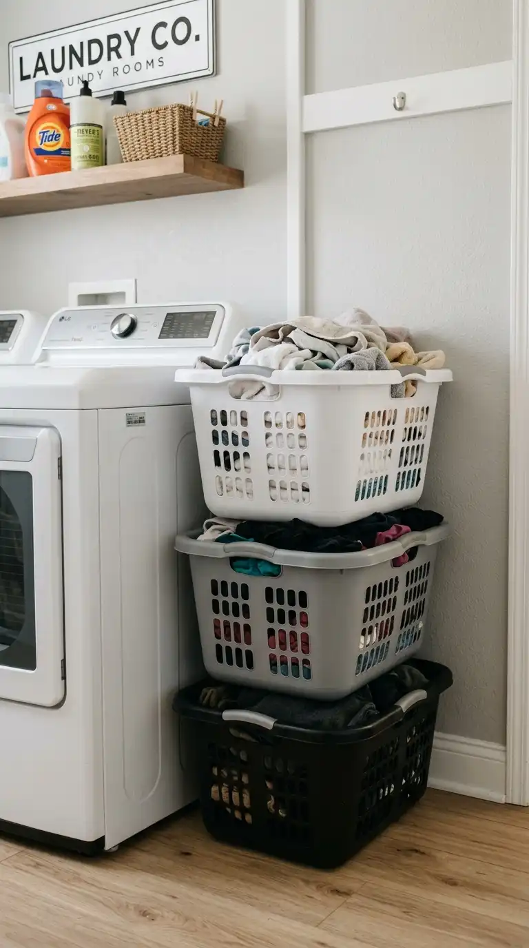 Stackable laundry baskets are a simple, affordable storage solution. Choose baskets that nest or stack securely. Use different colors for different family members or laundry types. Stack them in a corner of the laundry room, in a closet, or beside the washer. When it’s laundry day, grab the basket you need and go.
