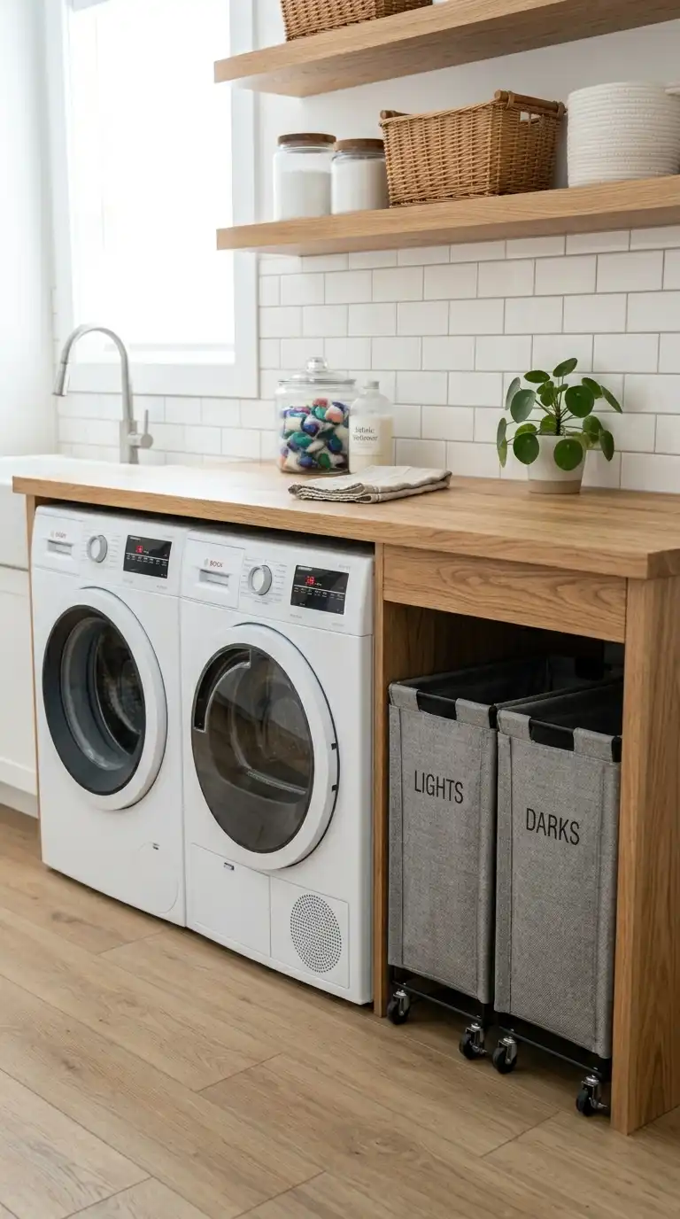 If you have a countertop over your washer and dryer, use the space underneath for rolling laundry baskets. Measure the height carefully to ensure the baskets fit. Choose low-profile baskets on wheels that slide easily in and out. This keeps baskets hidden but accessible.