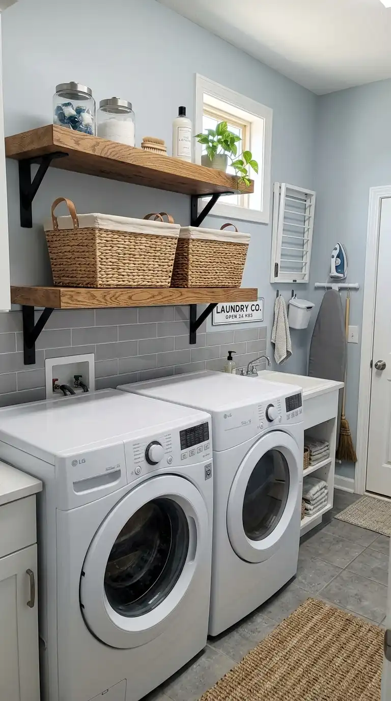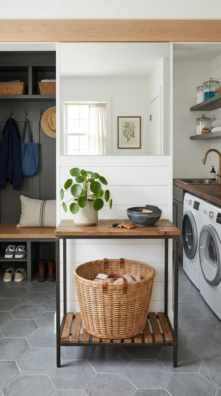 If your laundry room doubles as a mudroom or pass-through space, use a console table or narrow table with a lower shelf to store a laundry basket. The basket sits on the lower shelf, hidden from view but easily accessible. Use the tabletop for folding or holding supplies.