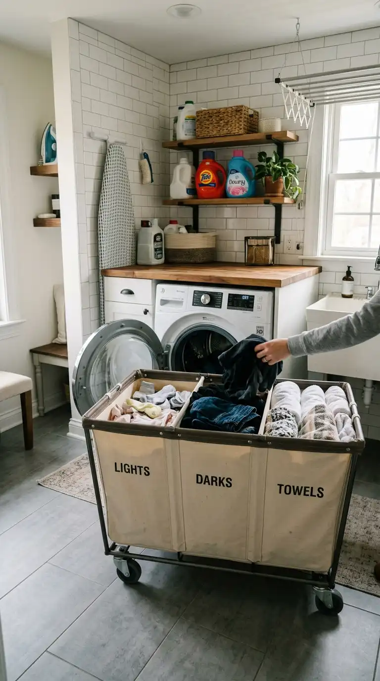 A large divided hamper on wheels is perfect for families who sort as they go. Look for a hamper with two or three compartments and a sturdy frame. Wheel the entire hamper to the washer, sort directly into the machine, and wheel it back. This is a space-efficient alternative to multiple individual baskets.