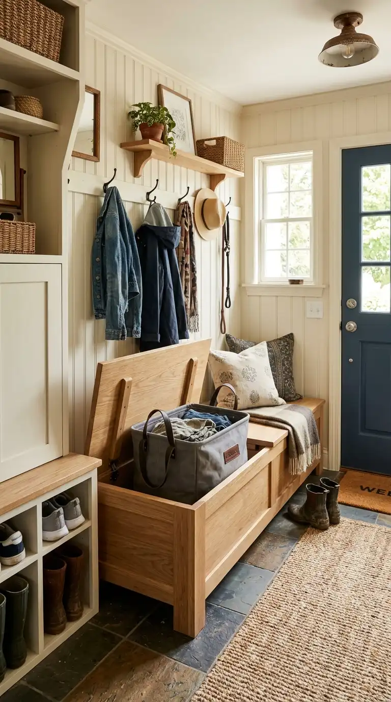 Combine seating with laundry storage by building a bench with a lift-up seat hiding a laundry basket inside. This is perfect for mudrooms, bathrooms, or bedrooms. Use a removable fabric liner for easy transport to the laundry room. The bench provides a place to sit while putting on shoes.