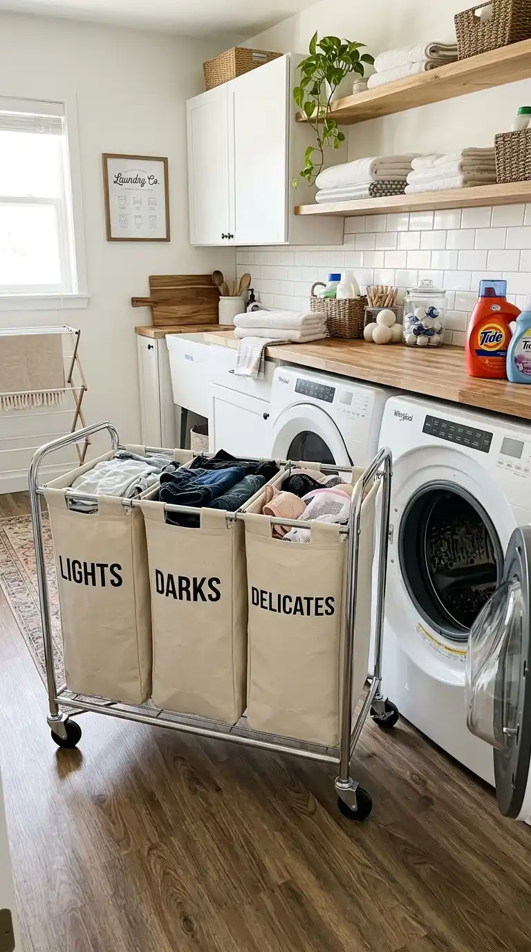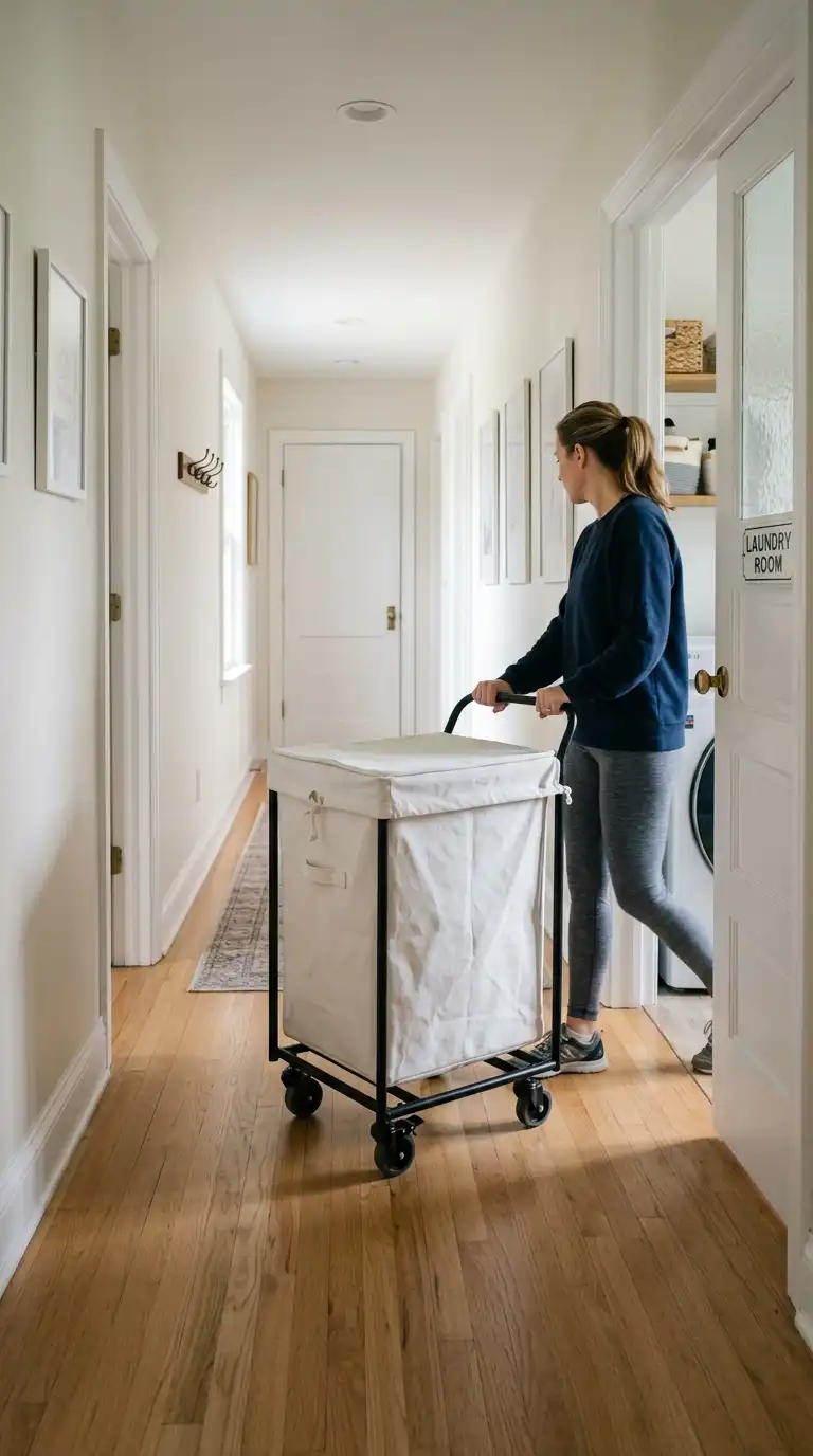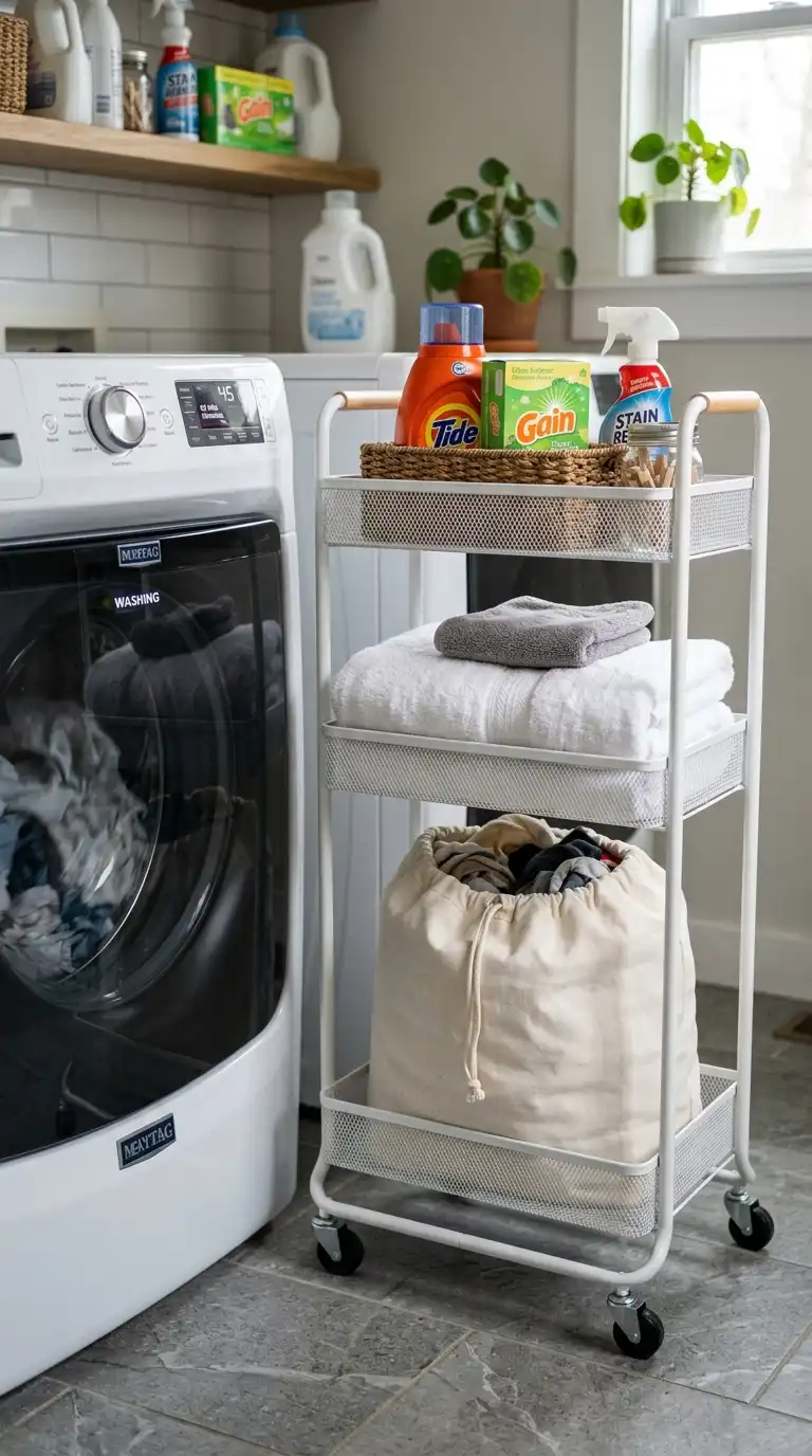A simple wire or plastic rolling cart can function as a mobile hamper. Use it to collect laundry from around the house, roll it to the machine, and load directly from the cart. Choose a cart with removable bins for easy carrying. When not in use, tuck it into a closet.