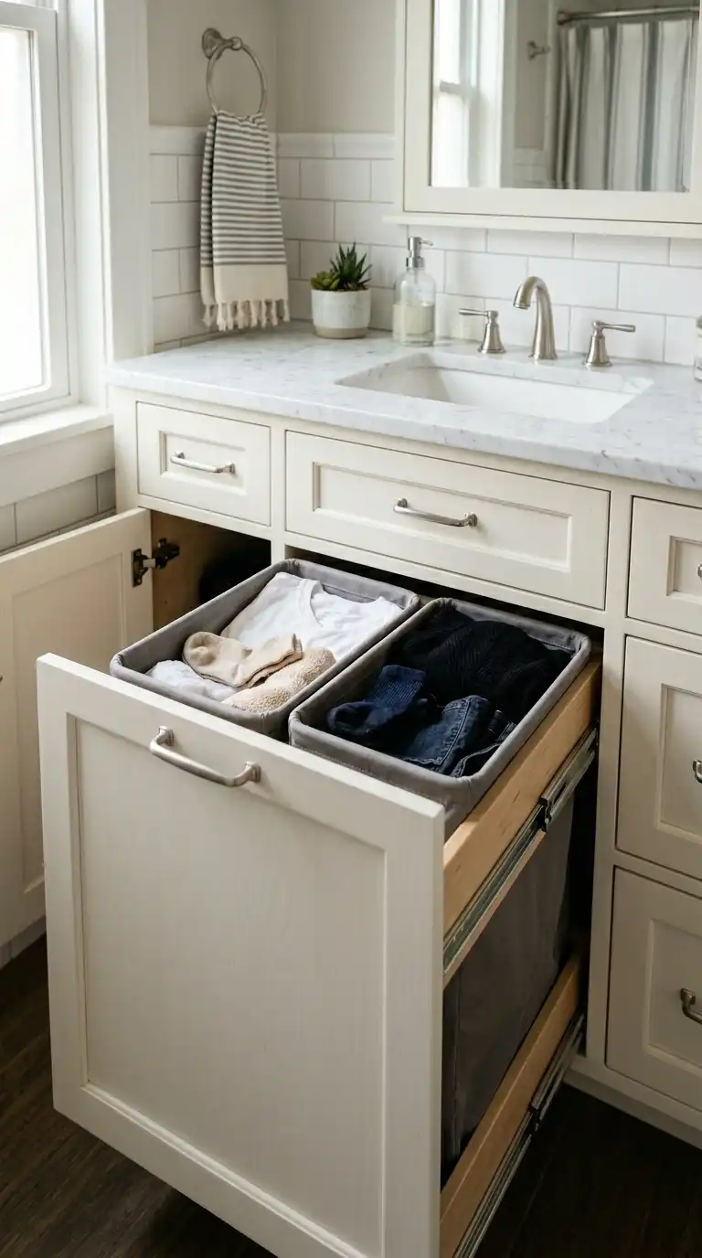 A pull-out hamper hidden inside a cabinet keeps dirty laundry completely out of sight. Install a tilt-out or pull-out bin in your bathroom or laundry room cabinetry. Choose a model with two compartments for sorting. When guests visit, the hamper disappears behind a cabinet door.