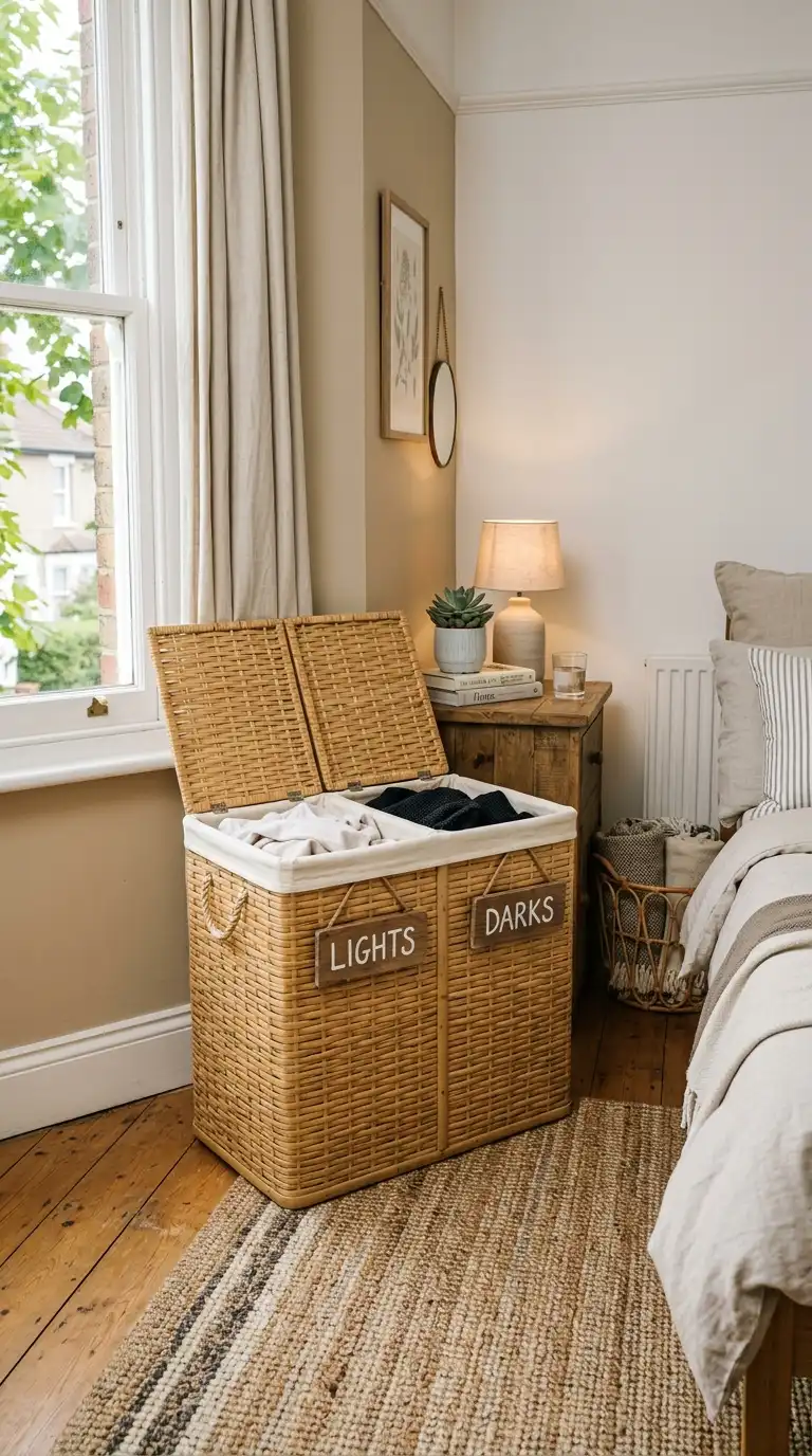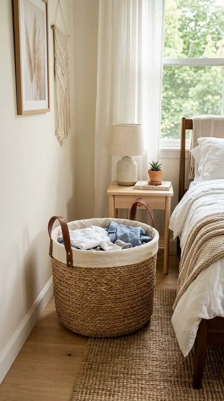 A large woven seagrass, rattan, or water hyacinth basket can serve as a stylish hamper in a bedroom or bathroom. The natural texture adds warmth and complements bohemian, coastal, or farmhouse decor. Use a fabric liner inside to prevent snags. The basket should have handles for easy transport to the laundry room.