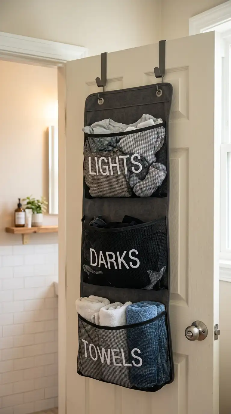 Use the back of a door for laundry storage. Hang an over-the-door hamper with multiple pockets or a single large bag. This is perfect for small bathrooms or closet laundry areas where floor space doesn’t exist. The hamper is hidden when the door is closed.