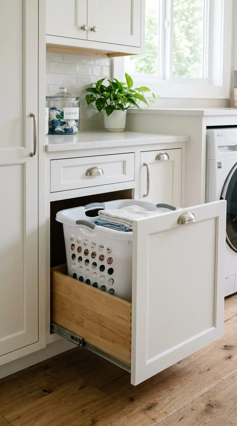 For a custom look, install a large pull-out drawer at the base of your cabinetry designed specifically to hold a laundry basket. The drawer glides out, revealing the basket. When closed, it looks like a regular drawer. This is ideal for high-end laundry rooms or bathroom vanities.
