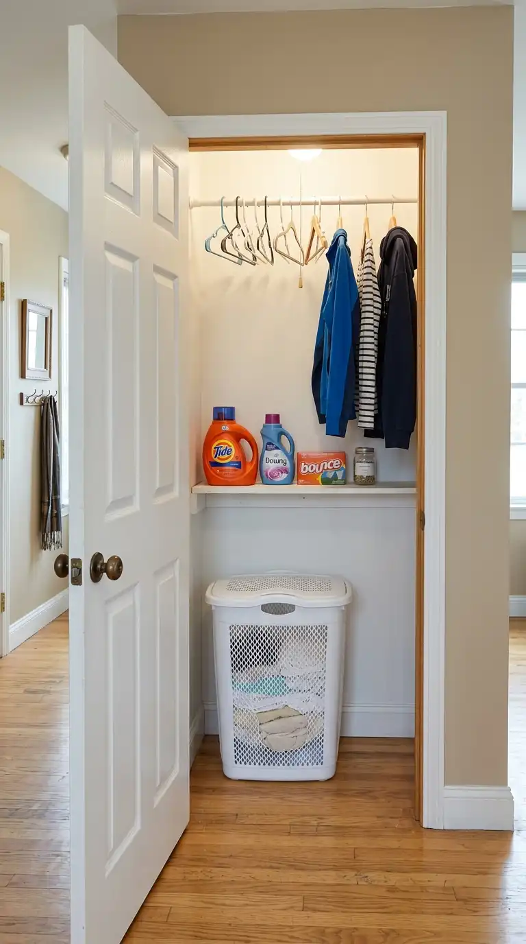 If you have a shallow hall closet, dedicate it entirely to laundry. Install a tension rod across the top for hanging clothes. Place a tall hamper or stacking bins on the floor. Use the shelf above for detergent and supplies. Close the door to hide all evidence of dirty laundry.