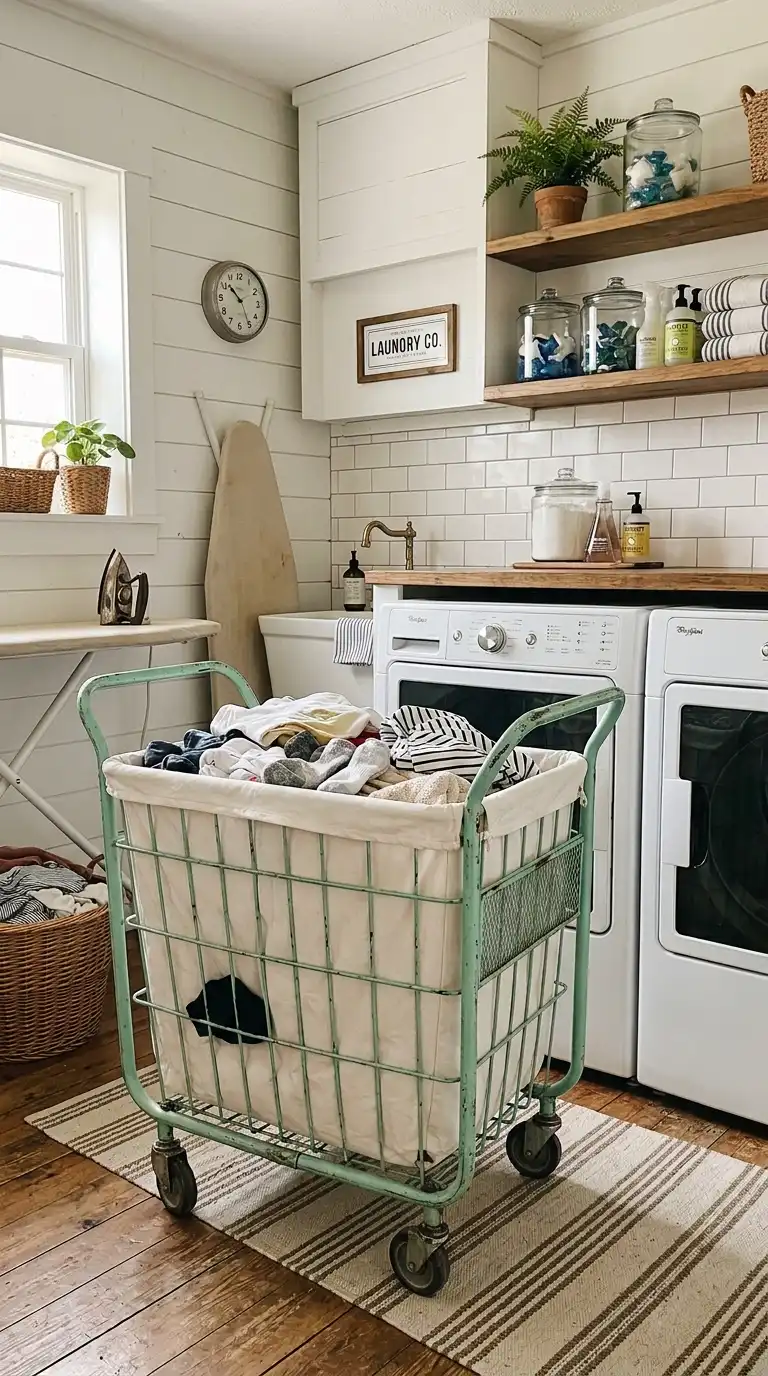 A vintage-style metal laundry cart on wheels adds retro charm. The open wire design allows air to circulate, preventing musty smells. Use it for storing dirty laundry or as a mobile cart for transporting clean clothes to folding areas. Look for a cart in a bright pastel color.