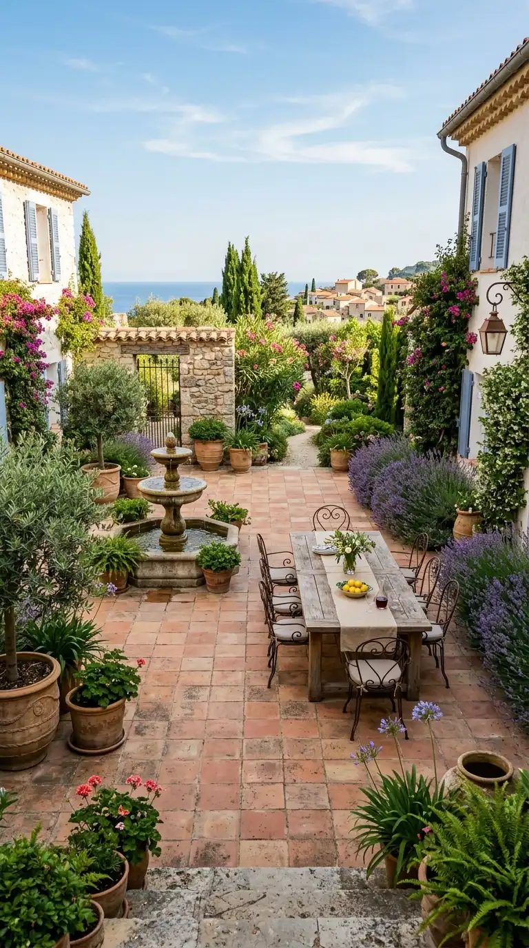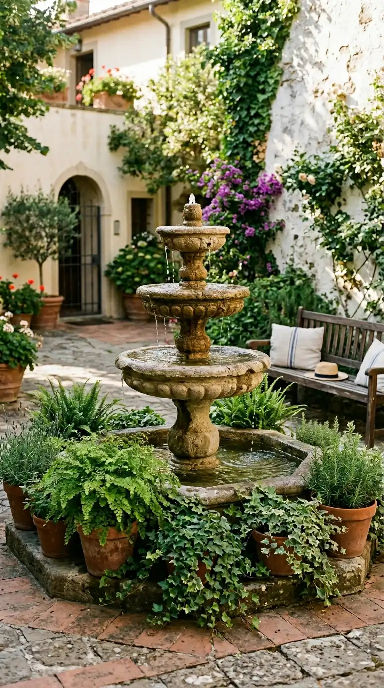 A central fountain is the heart of a Mediterranean courtyard. Choose a classic stone fountain with multiple tiers or a simple wall-mounted spout. The sound of trickling water adds tranquility and masks traffic noise. Surround the fountain with potted plants, a bench, and flowering vines. A fountain can be the focal point of a small courtyard or a grand entrance.