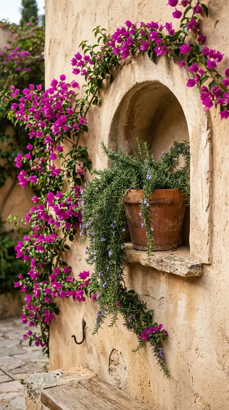 Stucco or stone walls add architectural interest and define garden rooms. Use warm, earthy tones—cream, beige, terracotta, or pale yellow. A stucco wall can serve as a backdrop for a fountain, a support for climbing vines, or a privacy screen. Add arched niches for statues or potted plants. The textured surface captures the play of light and shadow throughout the day.
