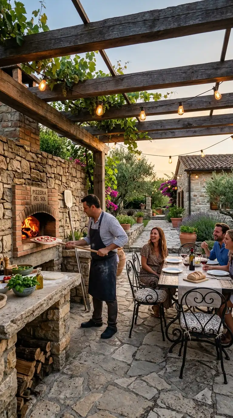 A Mediterranean outdoor kitchen centers around a wood-fired pizza oven. Build the oven from brick or stone, and surround it with a stucco or stone countertop. Add a grill, sink, and refrigerator for a full cooking experience. A wooden pergola overhead provides shade. Serve pizzas, grilled vegetables, and fresh seafood to guests gathered around the oven.