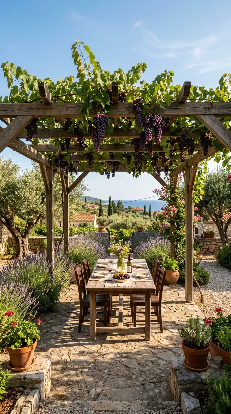 A pergola covered with grapevines provides dappled shade and a lush, romantic feel. Plant table grapes or wine grapes at the base of the pergola posts, and train the vines to grow over the top. In autumn, the leaves turn golden, and you can harvest the grapes. Add a dining table and chairs beneath for al fresco meals. The pergola creates a defined outdoor room.