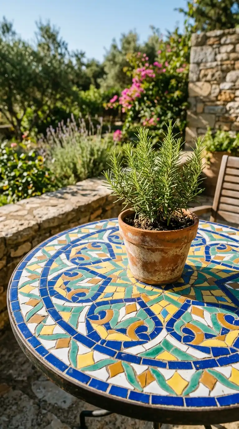 Add colorful mosaic tile accents to your Mediterranean garden. Use tiles on tabletops, planters, stair risers, or as wall art. Choose traditional patterns or abstract designs in bright Mediterranean colors—blue, yellow, green, and terracotta. Mosaic tiles add a handcrafted, artistic element that celebrates the region’s rich craft traditions.