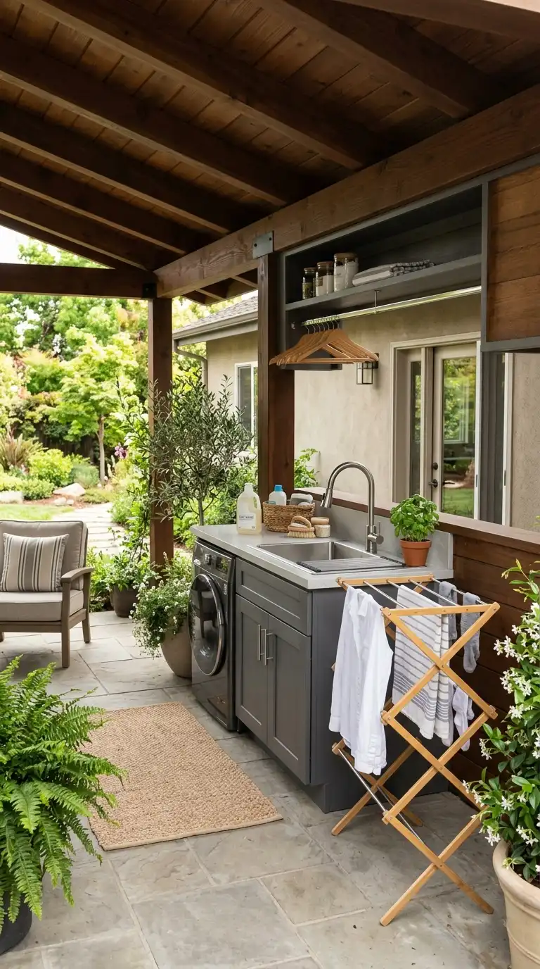 Create a dedicated laundry area on a covered patio to protect your appliances and supplies from rain and sun. Use weather-resistant materials like stainless steel, treated wood, or outdoor-rated cabinets. Install a countertop for folding, a utility sink for soaking, and cabinets for storing detergent and supplies. Hang a clothesline or install a folding drying rack nearby.