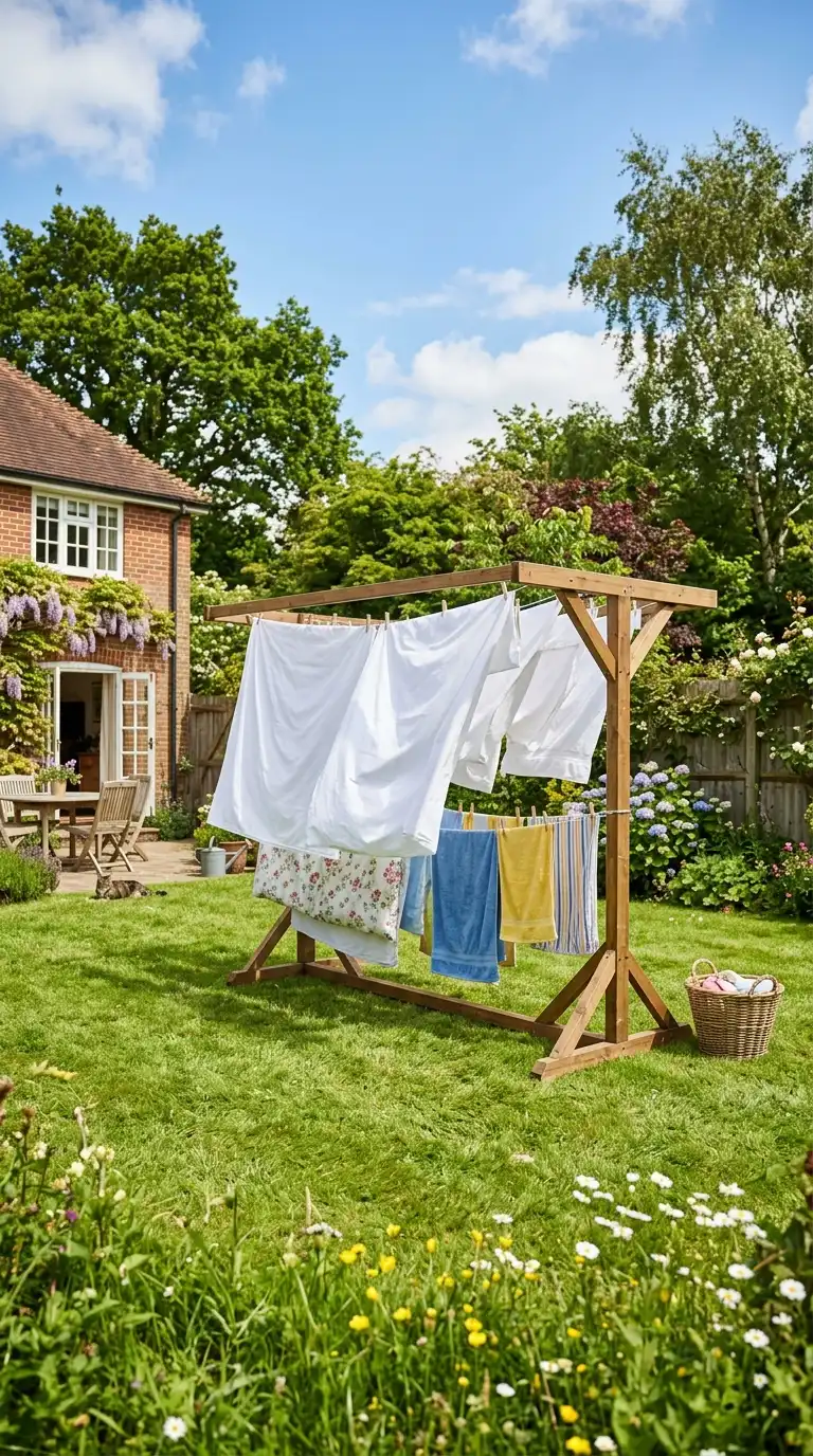 A large freestanding drying rack is the simplest outdoor laundry solution. Choose a wooden or metal rack with multiple lines or rungs. Place it in a sunny, breezy spot in your yard. When not in use, the rack can be folded flat and stored. This is perfect for air-drying sheets, towels, and other large items.
