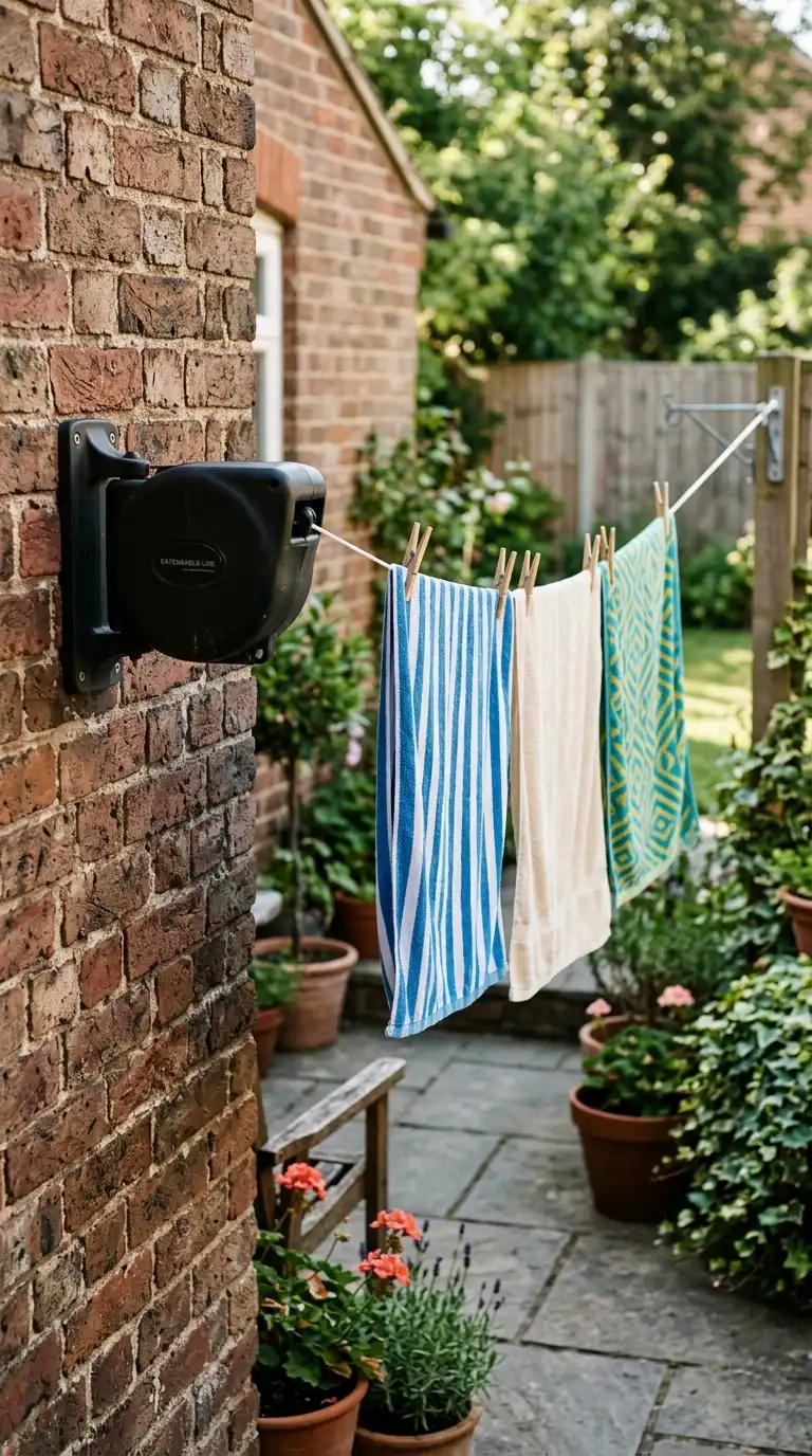 A retractable clothesline is a space-saving solution for small outdoor areas. Mount the retractable unit on a wall, post, or house siding. Pull the line across to another hook when needed, and retract it when not in use. Some models have multiple lines for larger loads. This is perfect for balconies, small patios, or rental properties.