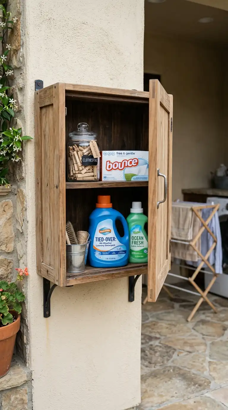 Install a weather-resistant cabinet to store laundry supplies like detergent, dryer sheets, clothespins, and stain removers. Choose a cabinet made of teak, cedar, or outdoor-rated polymer. Mount it on a wall or set it on the ground. Keep supplies dry and organized and within easy reach of your outdoor laundry area.