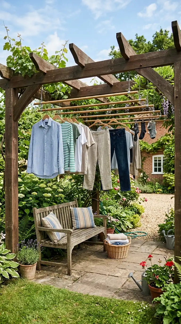 Build a pergola in your backyard and install hanging rods between the beams. Use the rods to air-dry clothes in the shade, which is gentler on fabrics than direct sunlight. The pergola also provides a defined, attractive structure for your outdoor laundry area. Add a bench or seating nearby for folding.