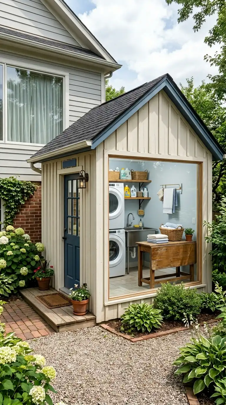 For the ultimate outdoor laundry solution, build a small dedicated outdoor room attached to your house or garage. Include a washer and dryer (if weather-protected), a utility sink, countertops, cabinets, and a drying rack. Install windows for natural light and a door for access. This is a significant project but adds value and convenience to your home.