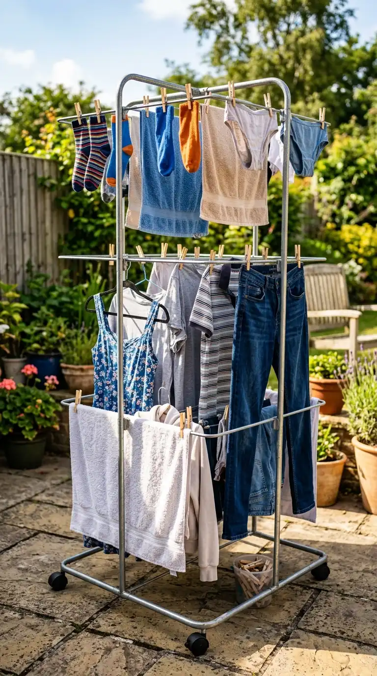 A portable drying rack on wheels can be moved to follow the sun or stored in a garage or shed when not in use. Choose a metal or wooden rack with multiple tiers and locking wheels. This is perfect for people who want flexibility in where they dry their clothes.