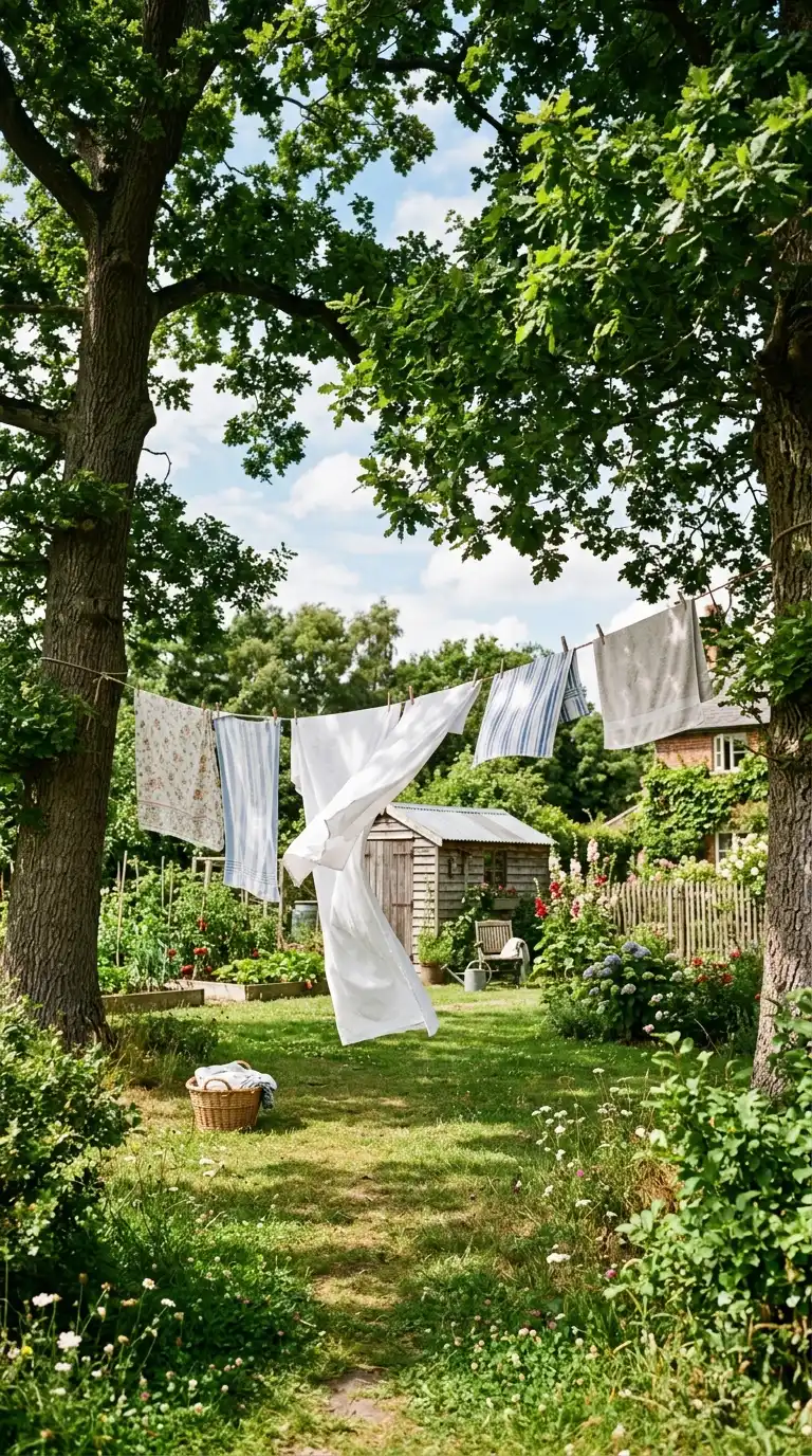 String a clothesline between two trees in your backyard for a natural, rustic drying solution. Use a rope or coated wire line, and secure it to the trees with hooks or straps. This is an inexpensive and easy option for large backyards. When not in use, the line can be taken down or left in place.