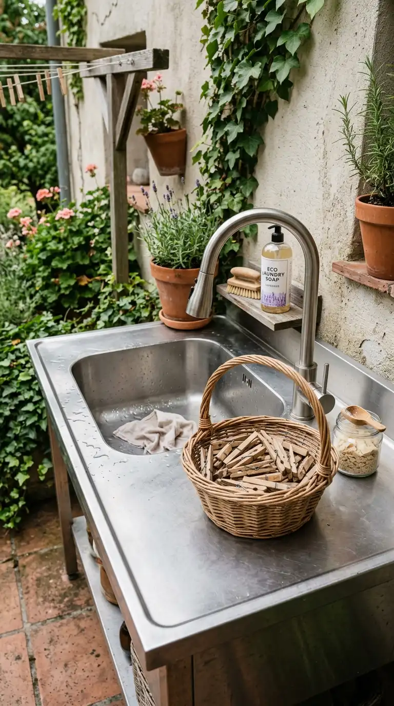 Create a simple outdoor laundry station with a weather-resistant countertop and a sink. Use a stainless steel or concrete countertop mounted on treated wood legs. Add a deep basin sink and a gooseneck faucet. Use the countertop for folding and sorting. This is a compact solution for small patios.