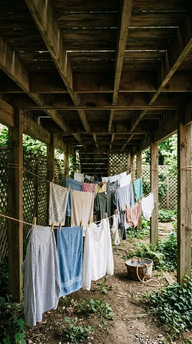 Create a covered drying area with a privacy screen to keep laundry out of sight from neighbors. Use a pergola, a roof overhang, or a fabric canopy for cover. Add lattice panels, bamboo fencing, or outdoor curtains for privacy. This allows you to air-dry clothes without feeling exposed.