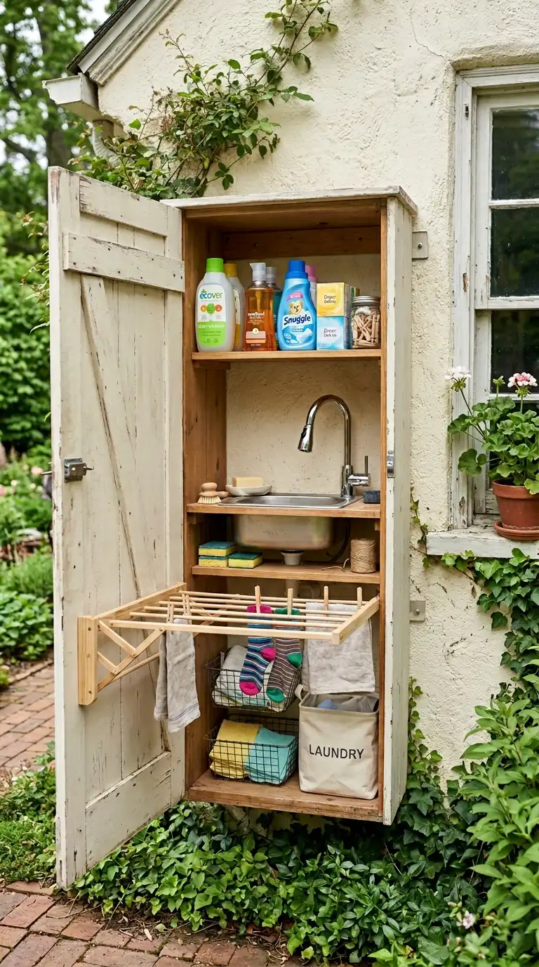 Build a small closet on an exterior wall to house your outdoor laundry supplies. The closet can hold clothespins, drying racks, a small sink, and even a compact washer. Use weather-resistant materials and a locking door. This is a compact, discreet solution for small yards.