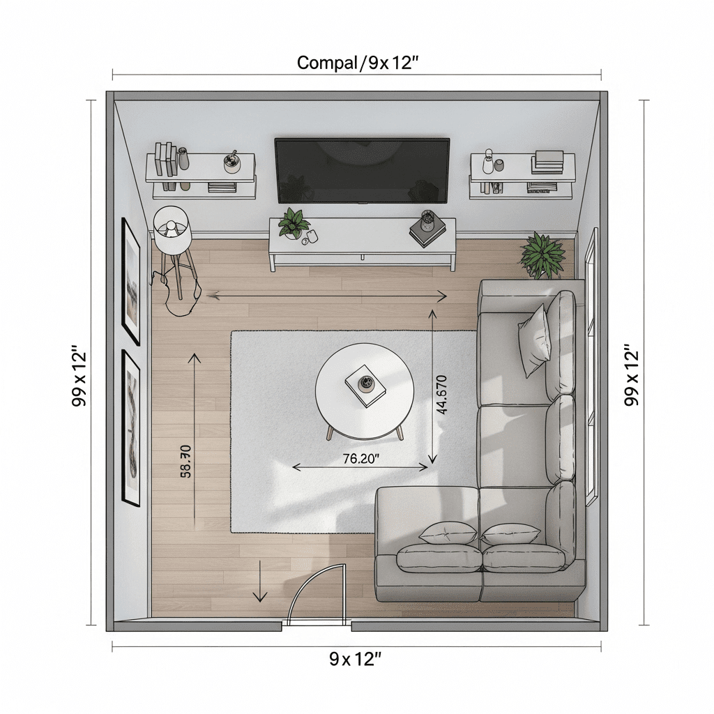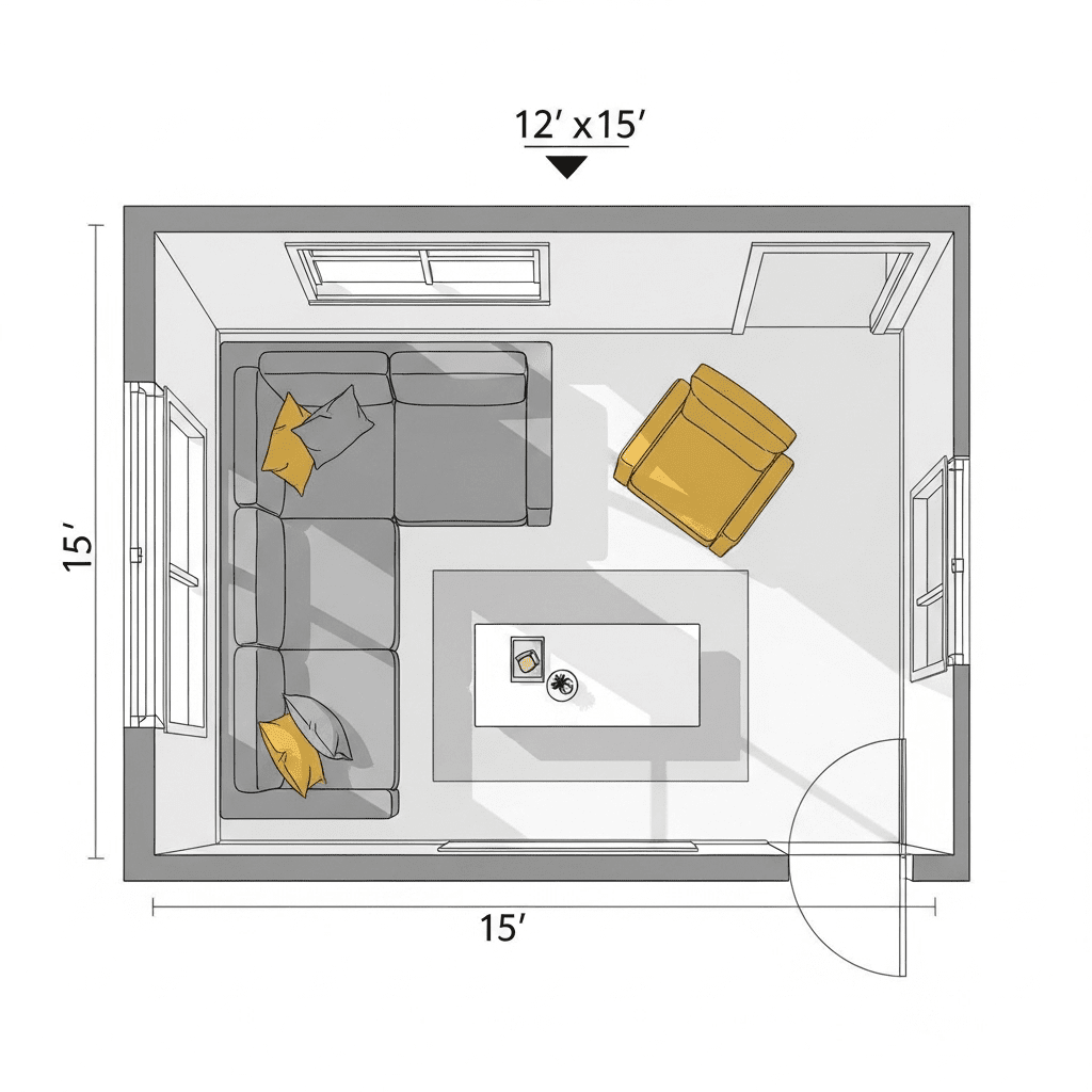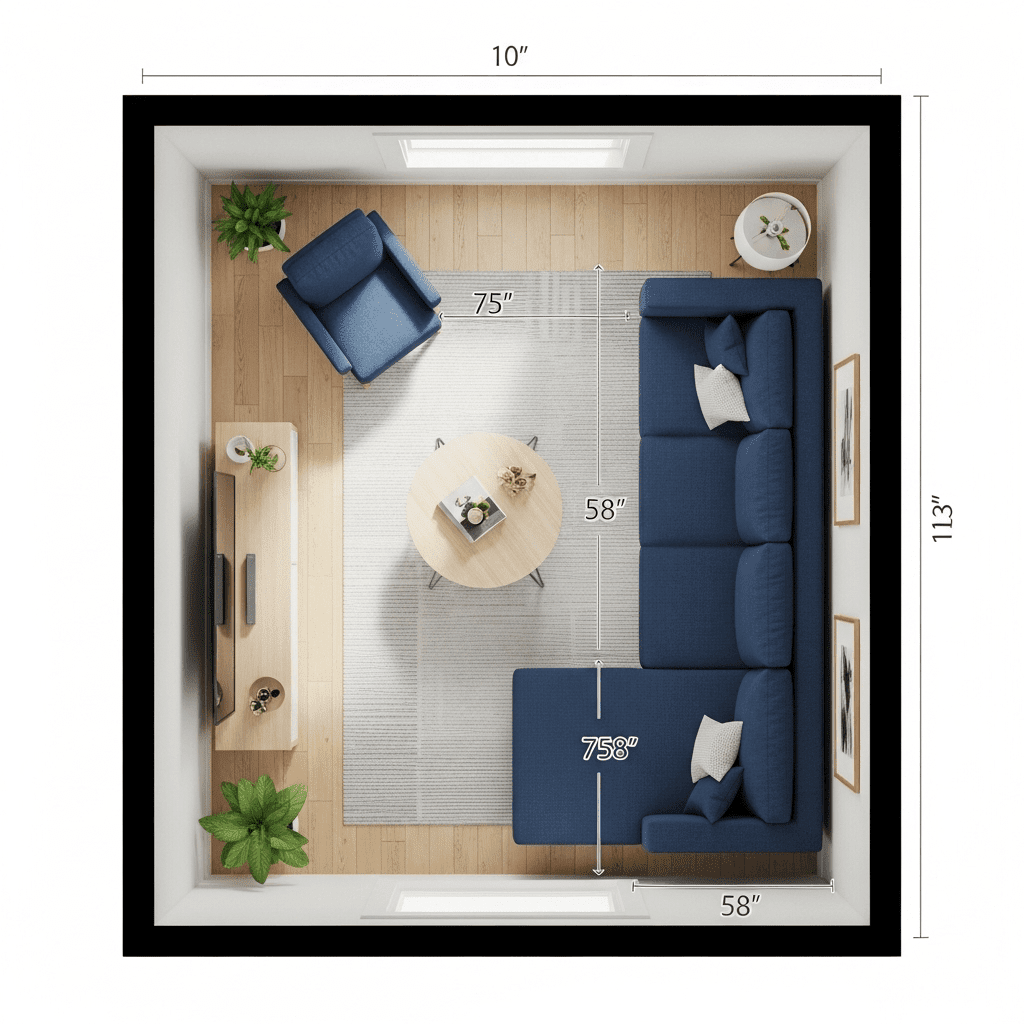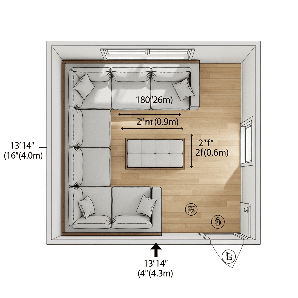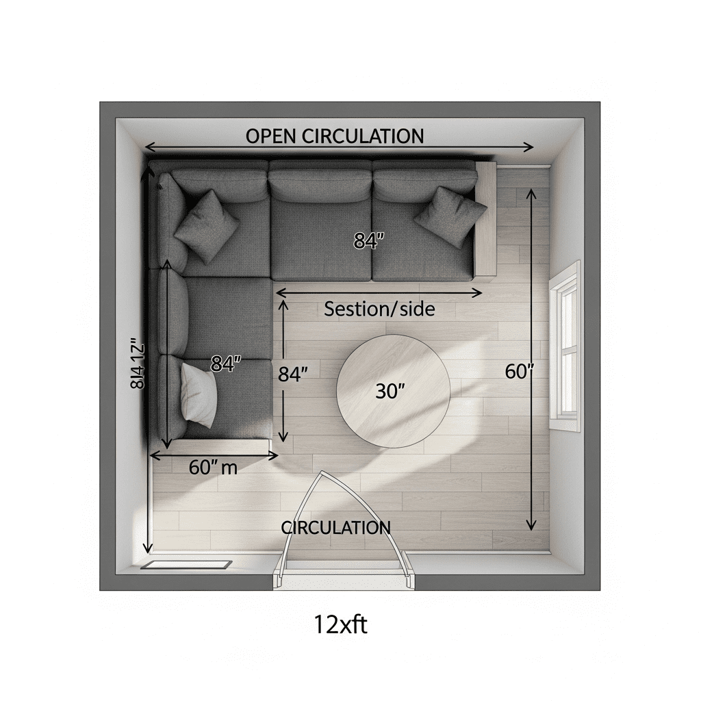 Behind Sectional: When floating sectionals, maintain 12-18 inches behind for circulation and cleaning access.