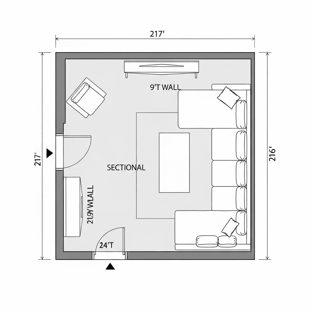 Area Rug Anchoring: Large rug under entire sectional anchors arrangement; ensure rug extends 12-18 inches beyond furniture edges.