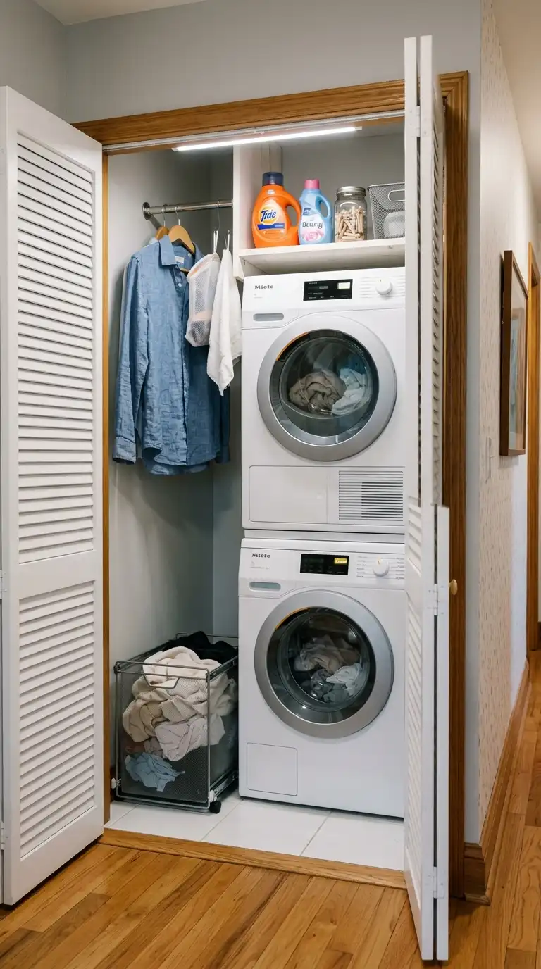 Convert a shallow closet into a functional laundry room. Remove the closet doors or install bifold doors that can be opened fully. Stack a compact washer and dryer unit, or use a single combination washer-dryer. Add a narrow shelf above for supplies and a small rod for hanging delicates. Use a pull-out hamper below the machines for dirty clothes.