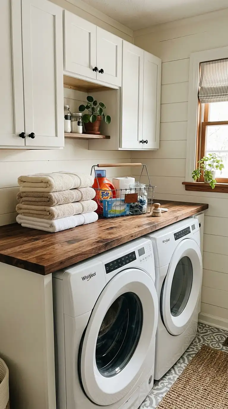 If you have front-loading washer and dryer, install a countertop over them to create a folding station. Use butcher block, laminate, or quartz. The countertop provides valuable workspace without taking up additional floor space. Use the area above for wall cabinets or open shelving. Leave enough clearance to open the machine doors fully.