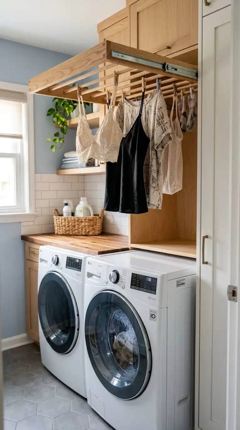 A pull-out drying rack is a space-saving solution for air-drying delicates. Install the rack above the washer and dryer or inside a narrow cabinet. When not in use, it slides away flat. Some racks pull out horizontally, while others drop down from above. Choose a wooden or metal rack that complements your decor.