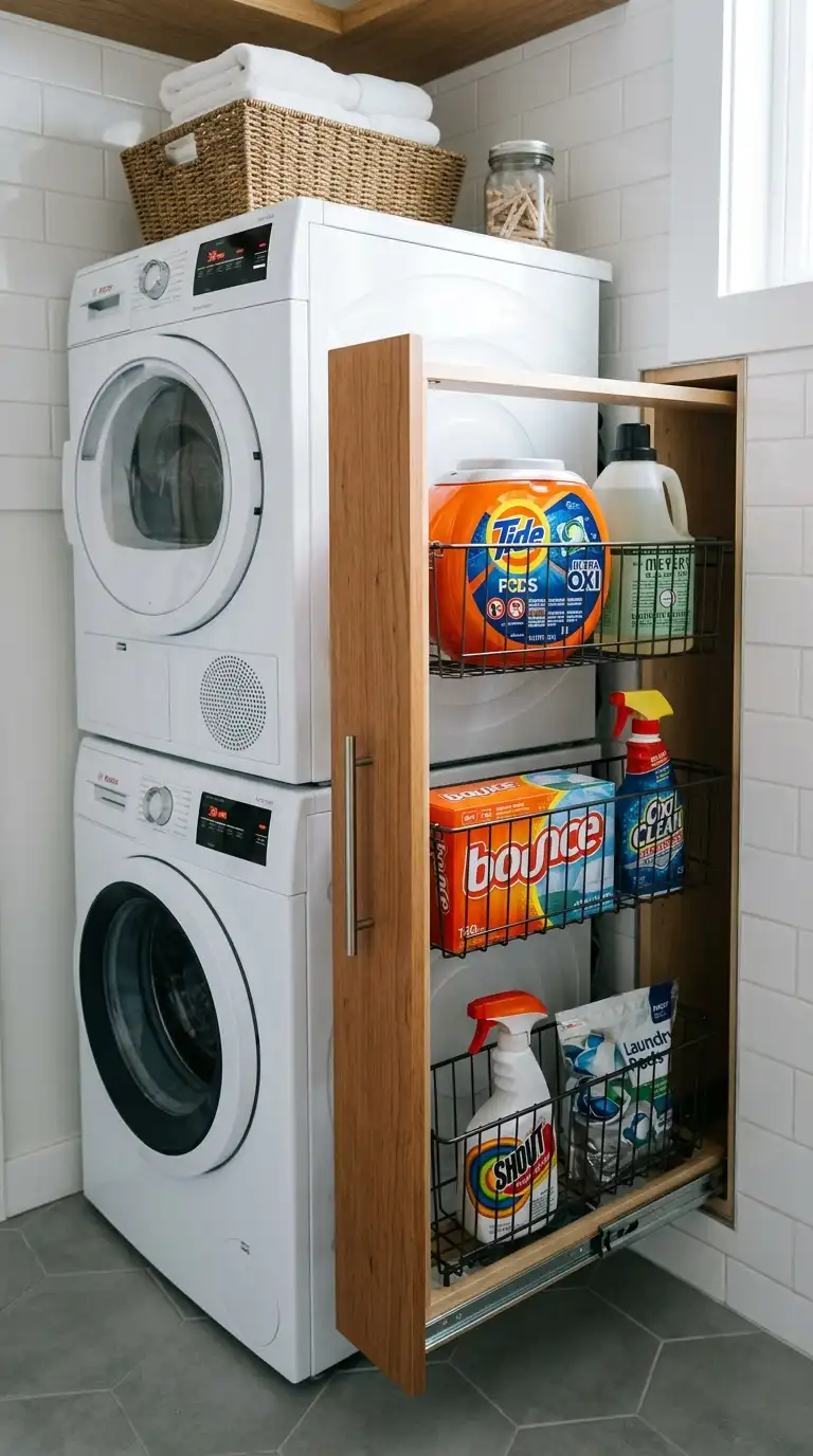 A narrow pull-out cabinet can fit into the smallest gap beside your washer and dryer. Use it to store detergent, dryer sheets, stain removers, and other supplies. Install pull-out wire baskets or shelves inside for easy access. This is an excellent use of otherwise wasted space.