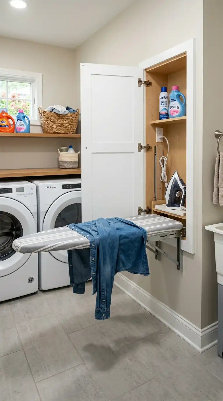A fold-down ironing board is a space-saving solution for small laundry rooms. Mount the board inside a cabinet or on the wall. When not in use, it folds flat and is barely noticeable. When needed, it folds down to provide a full ironing surface. Some models include a built-in iron rest.