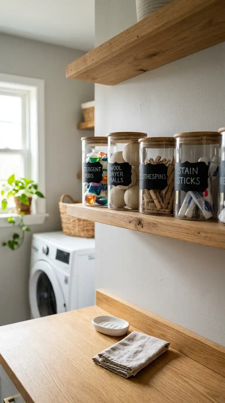 Store small laundry supplies in glass jars on open shelves. This keeps items visible and adds a decorative touch. Use jars for detergent pods, dryer balls, clothespins, and stain sticks. Label each jar with a tag or chalkboard label. Group jars on a single shelf to keep the counter clear.