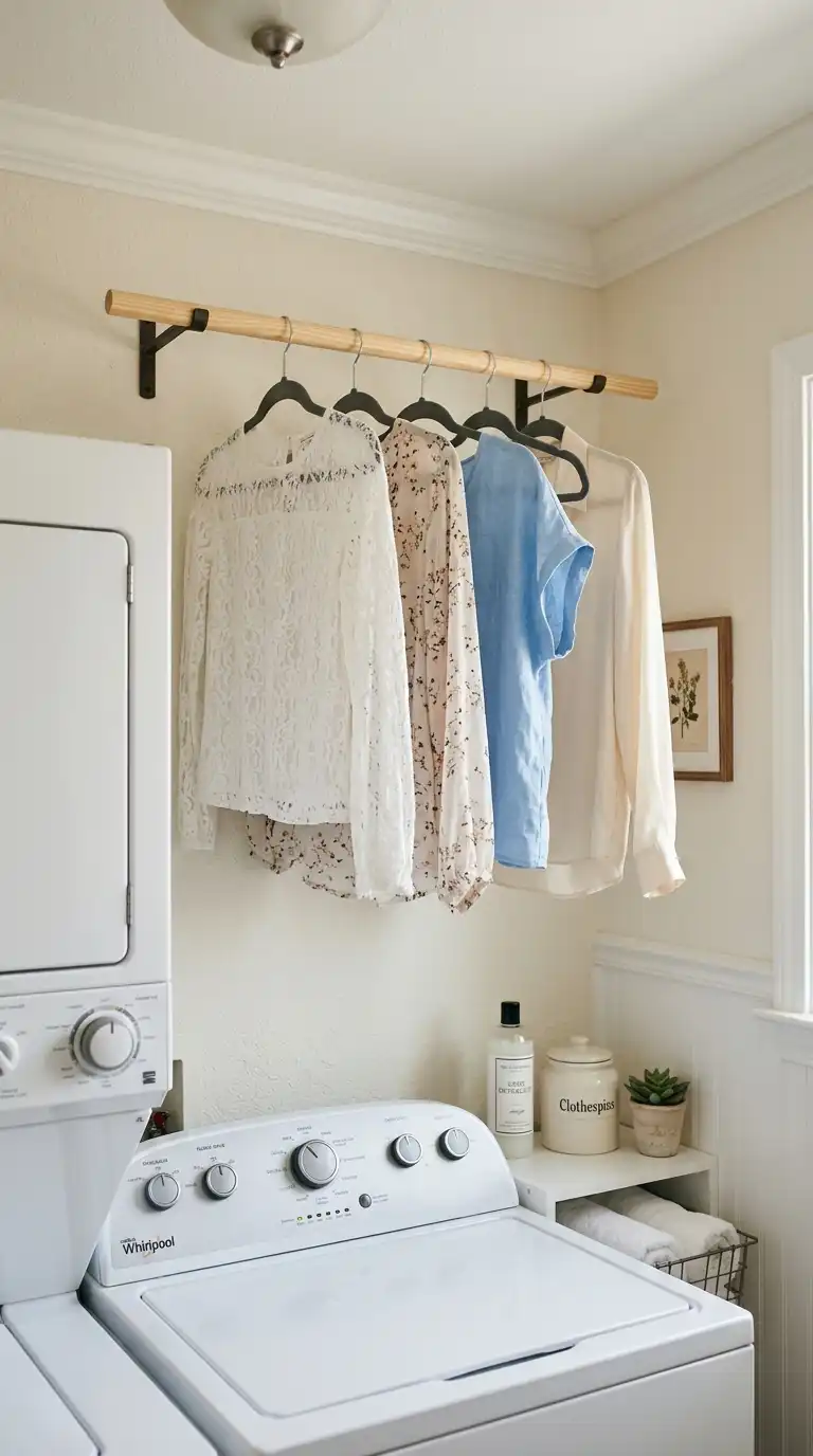Install a small hanging rod above the washer and dryer or in a narrow space between cabinets. Use it for air-drying delicate items that cannot go in the dryer. The rod can be fixed or retractable. Add a few wooden or velvet hangers for a neat appearance.