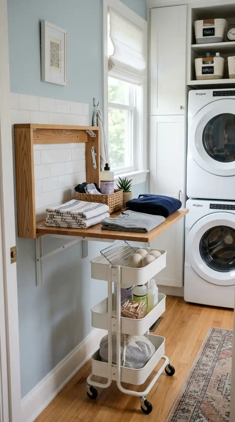 If you don’t have space for a full countertop, install a narrow folding table that drops down from the wall. Use it as a folding station when needed, then fold it flat when not in use. Mount it above a rolling cart or a narrow hamper. Some tables include a built-in storage pocket for supplies.