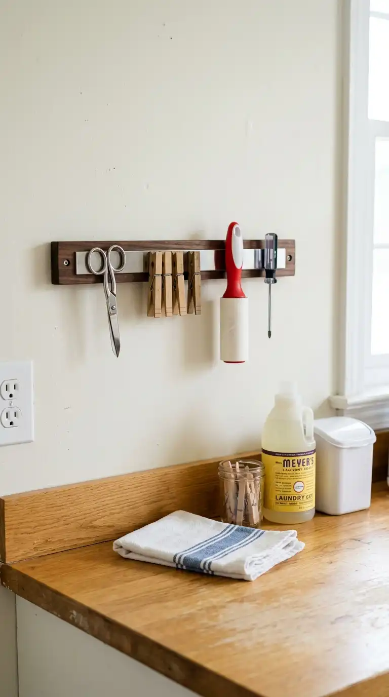 Install a magnetic strip on the wall or inside a cabinet door to hold small metal items. Use it for scissors, clothespins, tweezers for removing lint, and small screwdrivers for appliance maintenance. This keeps these items off the counter and easily accessible.