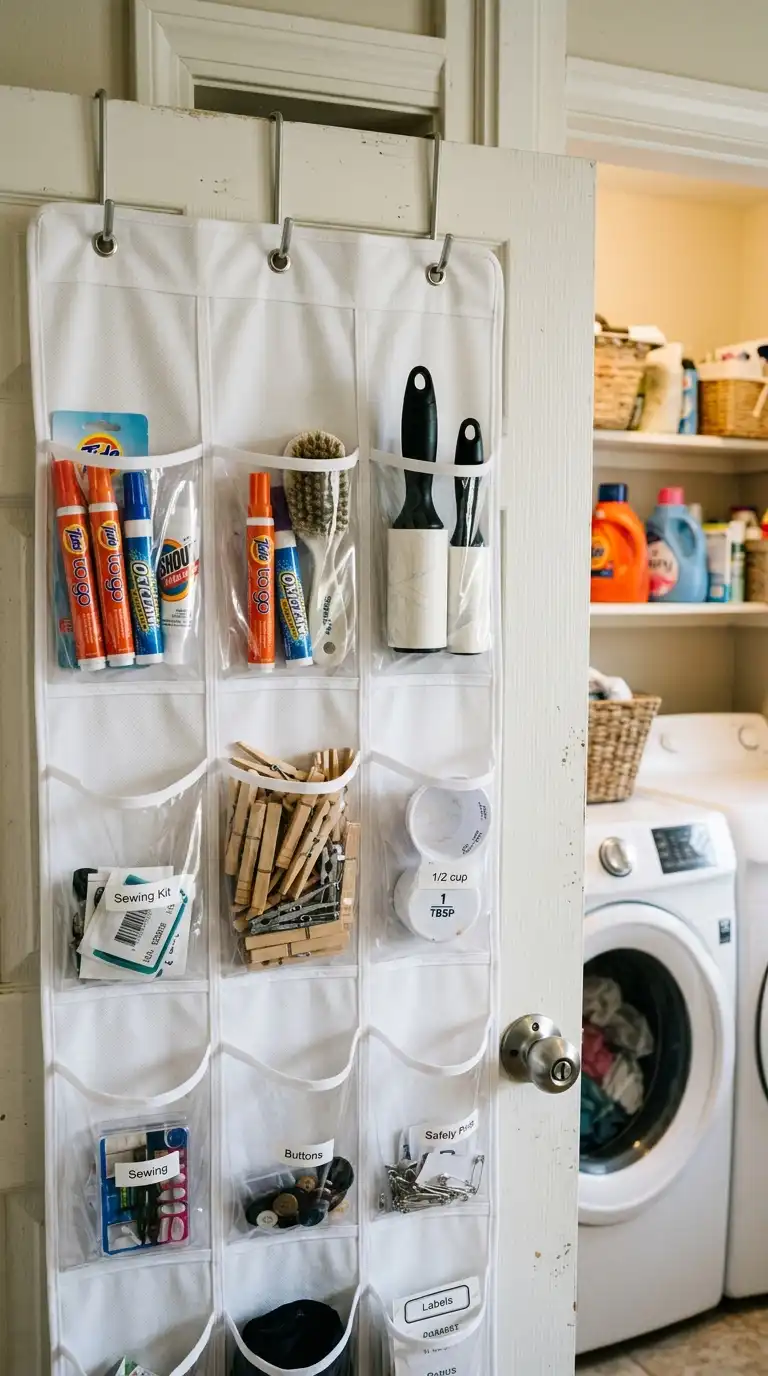Use the back of the laundry room door for additional storage. Install an over-the-door organizer with clear pockets for small items like stain sticks, lint rollers, clothespins, and measuring caps. This keeps supplies visible and accessible without taking up any floor or counter space.