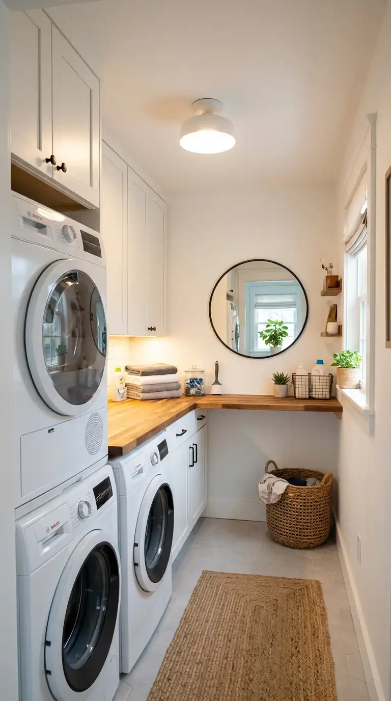 Stacking your washer and dryer is the single most effective way to save floor space in a small laundry room. A stackable unit or a stacking kit for side-by-side machines allows you to use the vertical space that would otherwise be wasted. Place the stacked units in a corner or inside a closet. Use the space beside or above the stack for narrow shelves or a hanging rod.