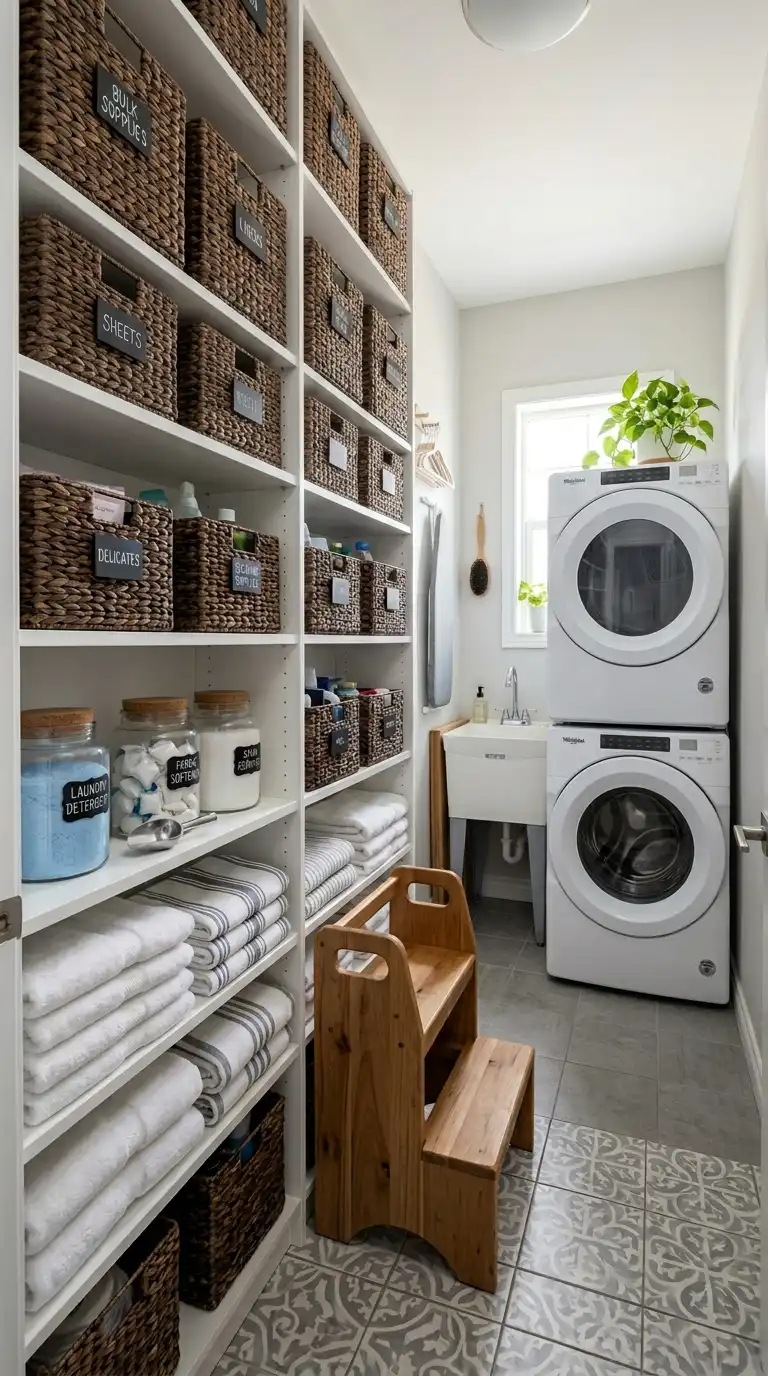 When floor space is limited, go up. Install floor-to-ceiling shelving on one wall to store detergent, dryer sheets, stain removers, and other supplies. Use the lower shelves for frequently used items and the higher shelves for bulk supplies or seasonal items. Use matching bins or baskets to keep the shelves looking tidy.