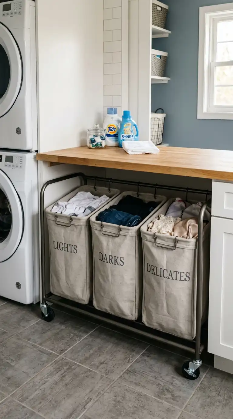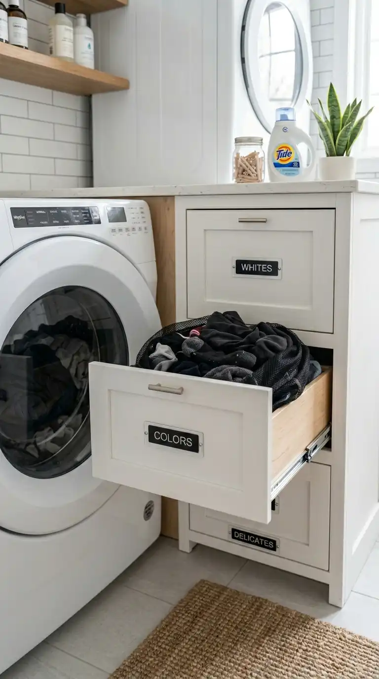 A pull-out hamper keeps dirty laundry concealed and saves floor space. Install a tall cabinet with two or three pull-out bins for sorting lights, darks, and delicates. The bins slide out when needed and tuck away when not in use. Position the hamper cabinet directly beside the washer for easy loading.