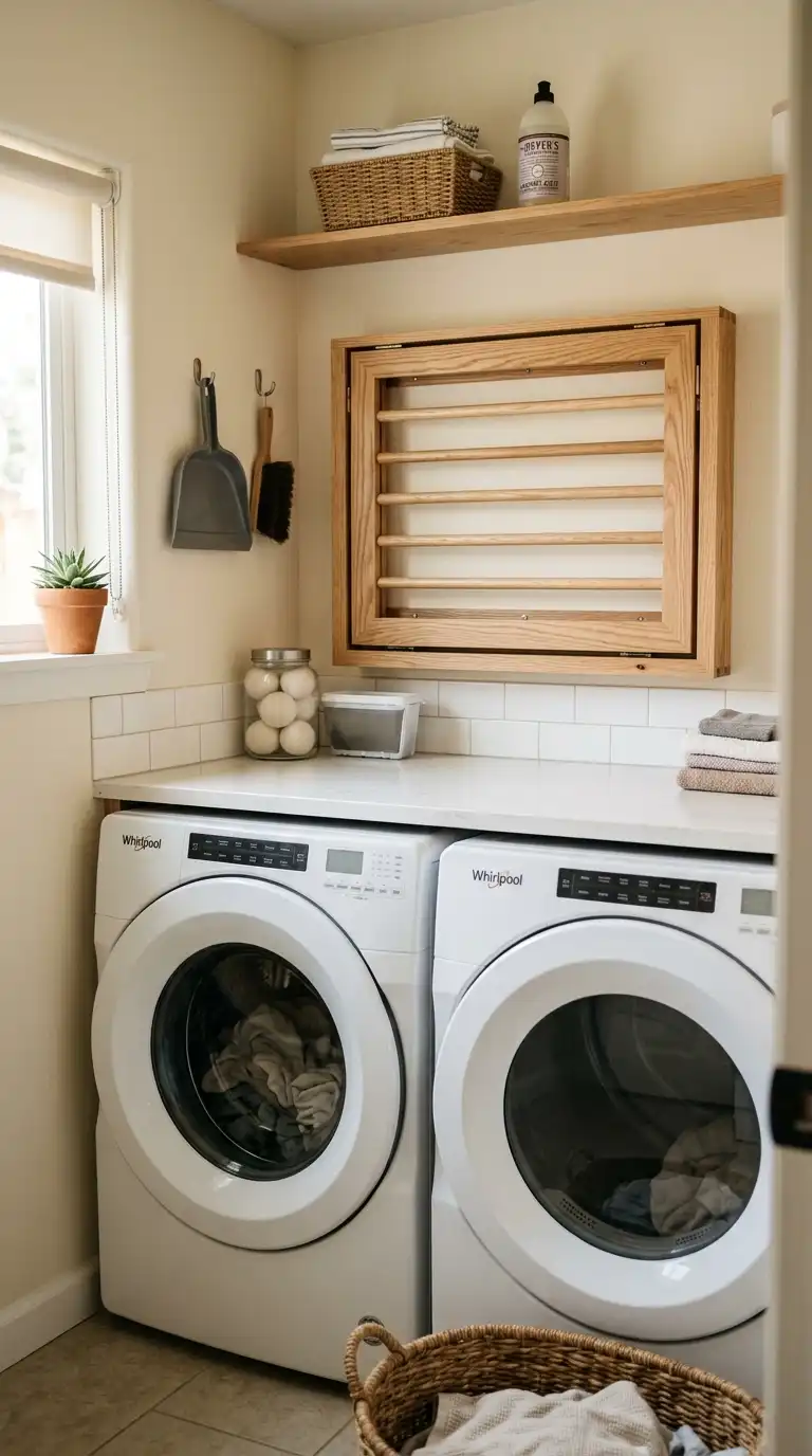 A wall-mounted drying rack folds flat against the wall when not in use and pulls down when needed. Install it above the washer and dryer or on an empty wall. This is an excellent solution for air-drying delicates without taking up floor space. Choose a wooden rack for a warm look or a metal rack for a modern aesthetic.